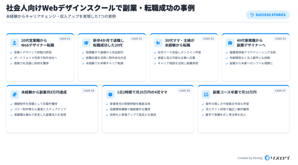 特に子育て中のママや副業を目指す会社員からは、オンラインで柔軟に学べる点や、実案件を通じて自信を持てたという声が目立ちます。