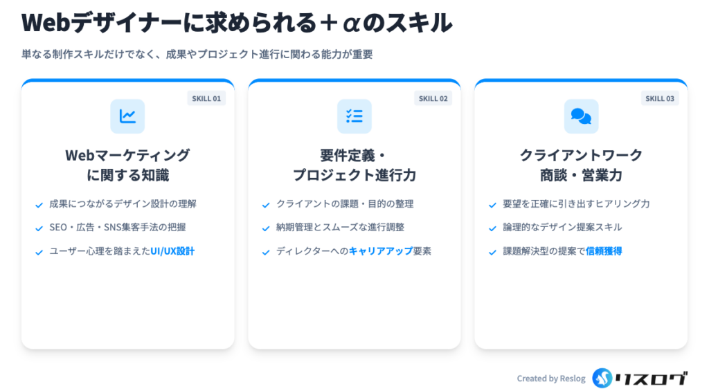 SEOや広告、SNSなどの集客手法、CV(お問い合わせや購入)につながる導線設計、ユーザー心理を踏まえたUI/UXを理解しているデザイナーは、クライアントからの評価も高くなります。