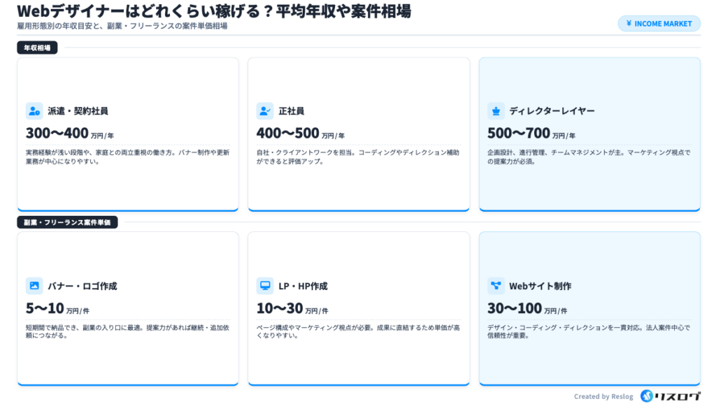 最初は低単価案件が中心になりやすいですが、LP制作やWebサイト制作など対応範囲が広がると収入も伸びやすくなります。