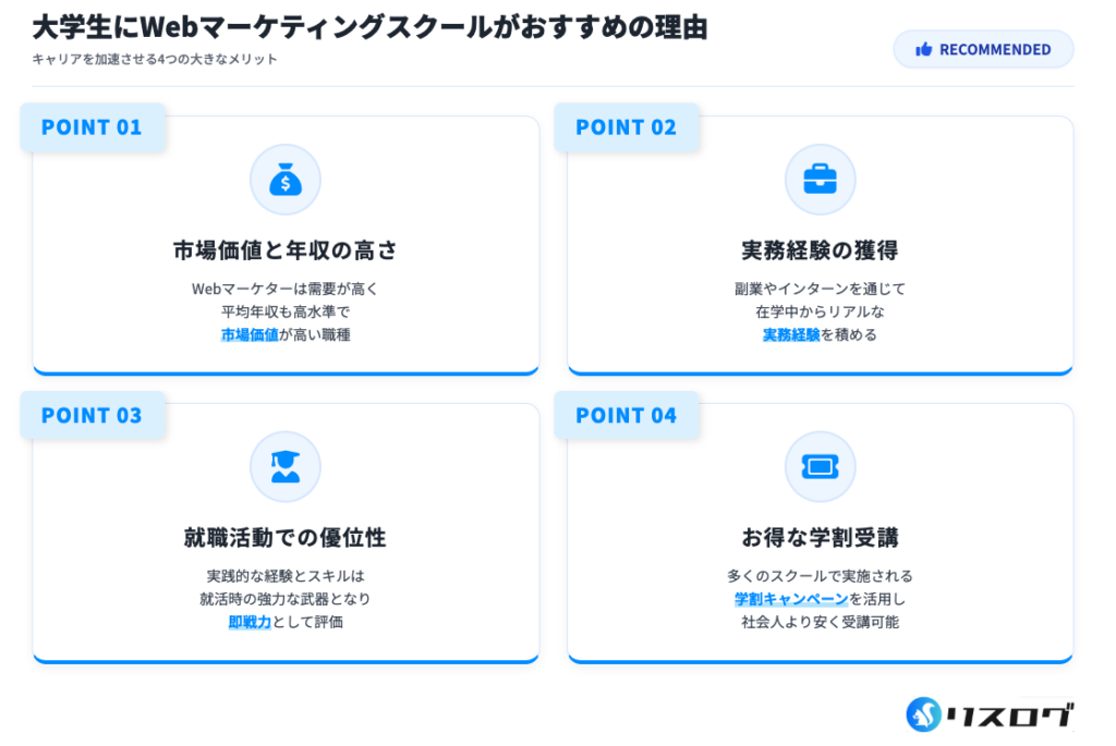 Webマーケティングは需要が高く、スキル次第で高収入を目指せるため、大学生のうちに基盤を作ることが成功の鍵です。