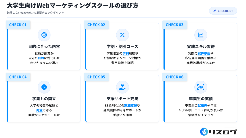 大学生がWebマーケティングスクールを選ぶ際は、目的に応じたカリキュラムを確認することが重要です。
