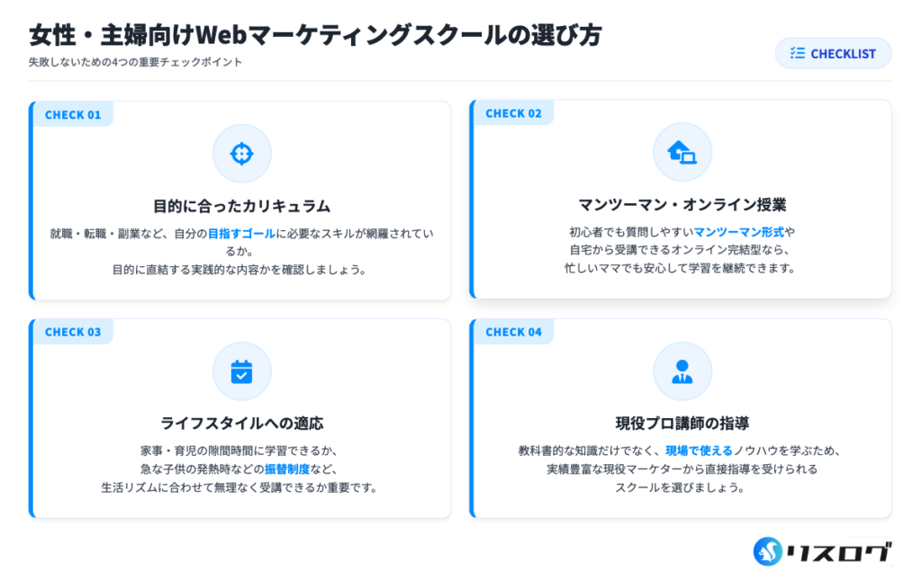 女性がWebマーケティングスクールを選ぶ際は、自分の学習目的に合ったカリキュラムがあるかを最初に確認しましょう。