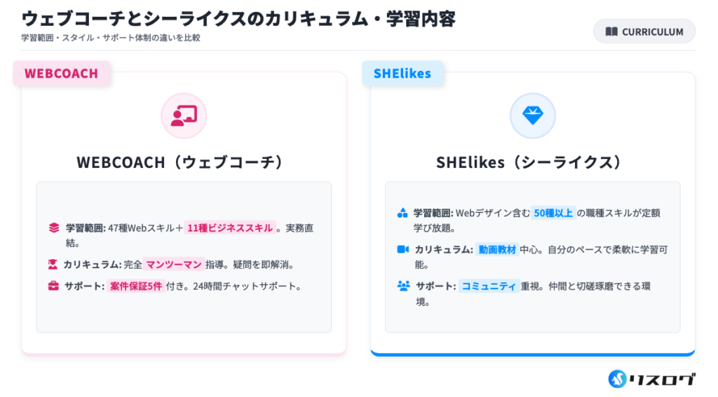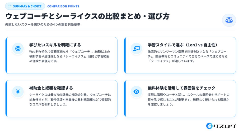 ウェブコーチはマンツーマン指導を強みとするスクールで、実践的なスキル習得と案件保証が魅力。一方、シーライクスは動画学習+コミュニティ型で、50種類以上のスキルを定額で学び放題。