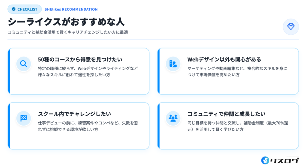 キャリアの方向性がまだ定まっていない人が、複数分野を試しながら適性を見極めたい場合に向いています。専門性を深めたいならウェブコーチ、幅広く学びたいならシーライクスという違いがあります。