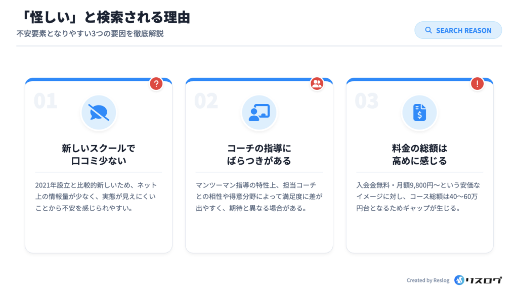 2021年設立で新しいスクールなので口コミが少ない・信頼性が低い