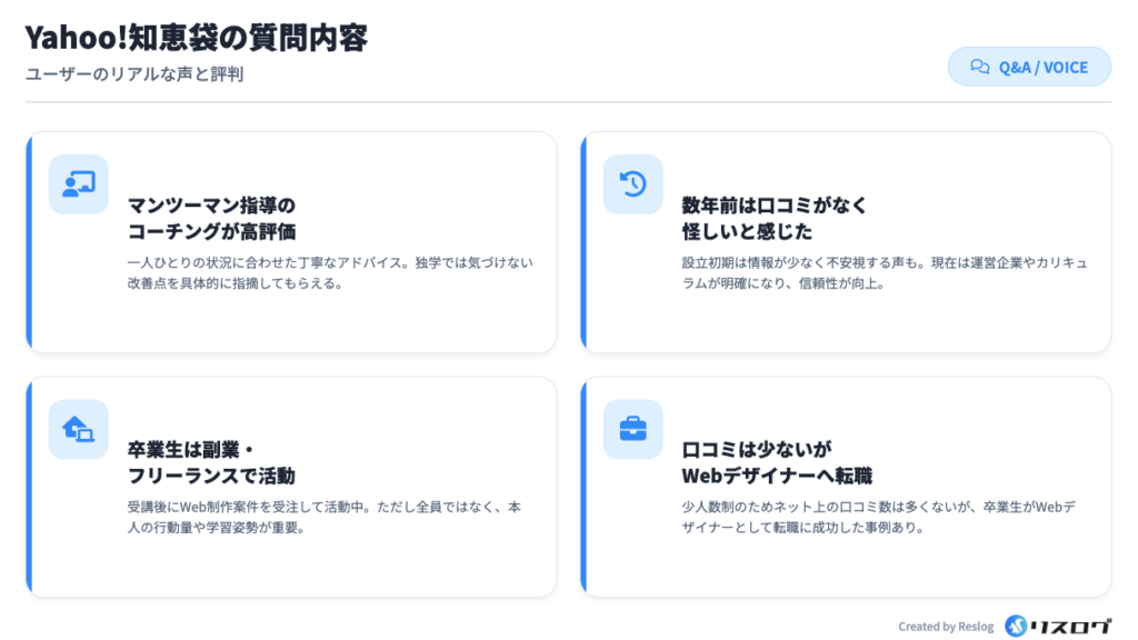 Yahoo!知恵袋では、「口コミ数自体は多くないが、卒業生がWebデザイナーとして転職している」という回答も確認できます。