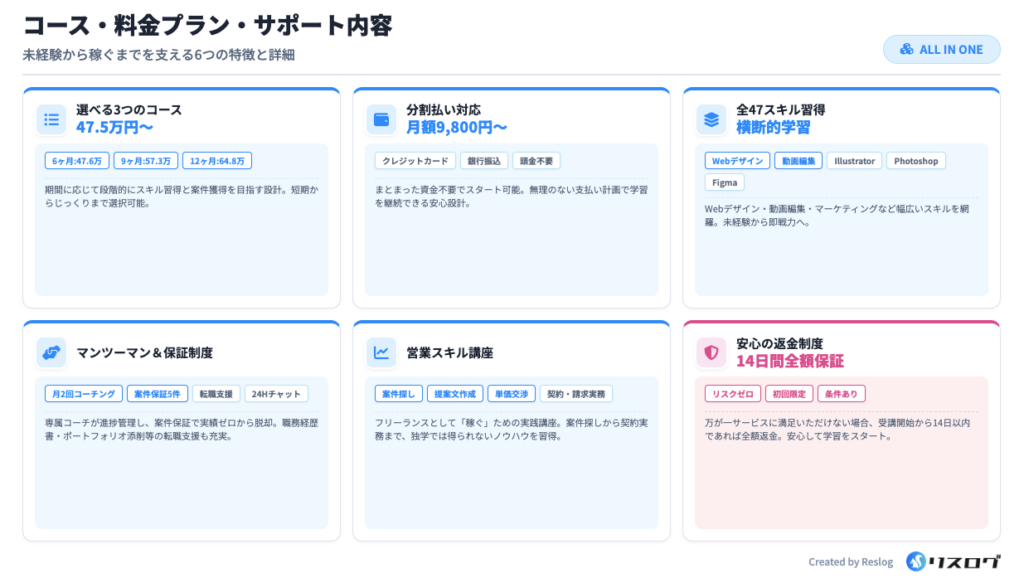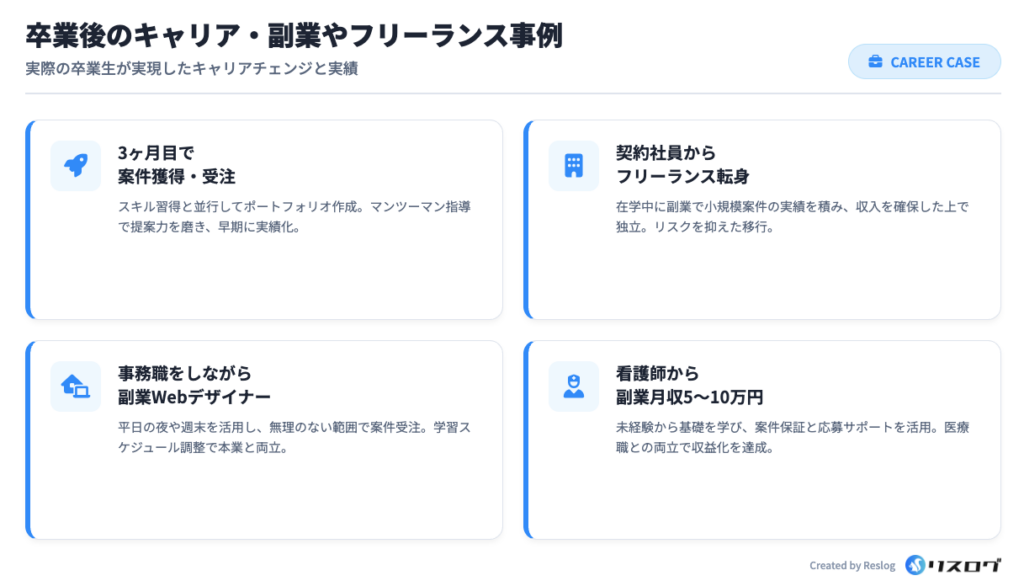短期集中で一気に学ぶスクールとは異なり、基礎学習から実践、案件獲得までを段階的に進めるため、「未経験から副業・フリーランスを目指す人」に向いた構成です。