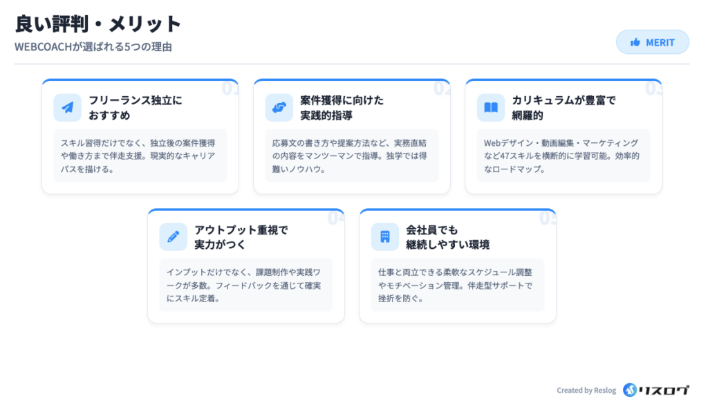 口コミでは、単にWebデザインやマーケティングのスキルを学ぶだけでなく、案件獲得や働き方まで含めて現実的に考えられる点が評価されています。