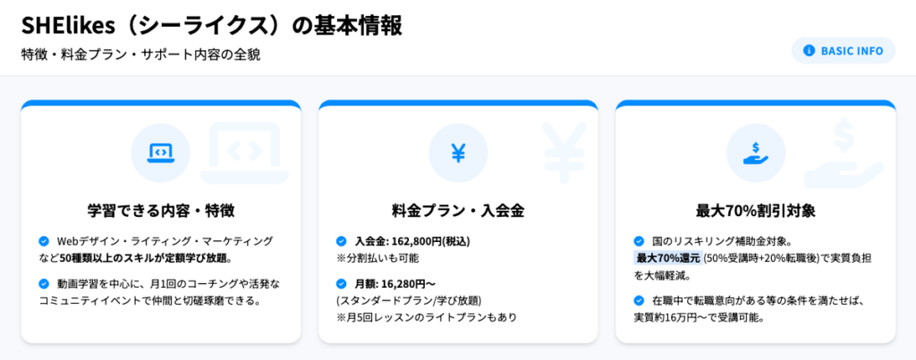 SHElikesは、国のリスキリング補助金制度の対象となっており、条件を満たせば受講料が最大70%割引されます。具体的には入会時に50%が即時還元され、転職成功後に追加で20%がキャッシュバックされる仕組みです。