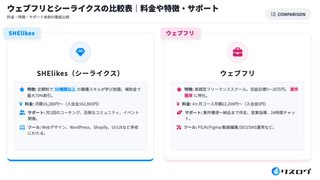 幅広い分野を試しながら、自分に合ったスキルを見つけたい方に最適です。一方でウェブフリは「稼ぐこと」をゴールにした実践型スクールで、WebデザインやSEOライティング、SNS運用など需要の高い6つのコースから選択可能。